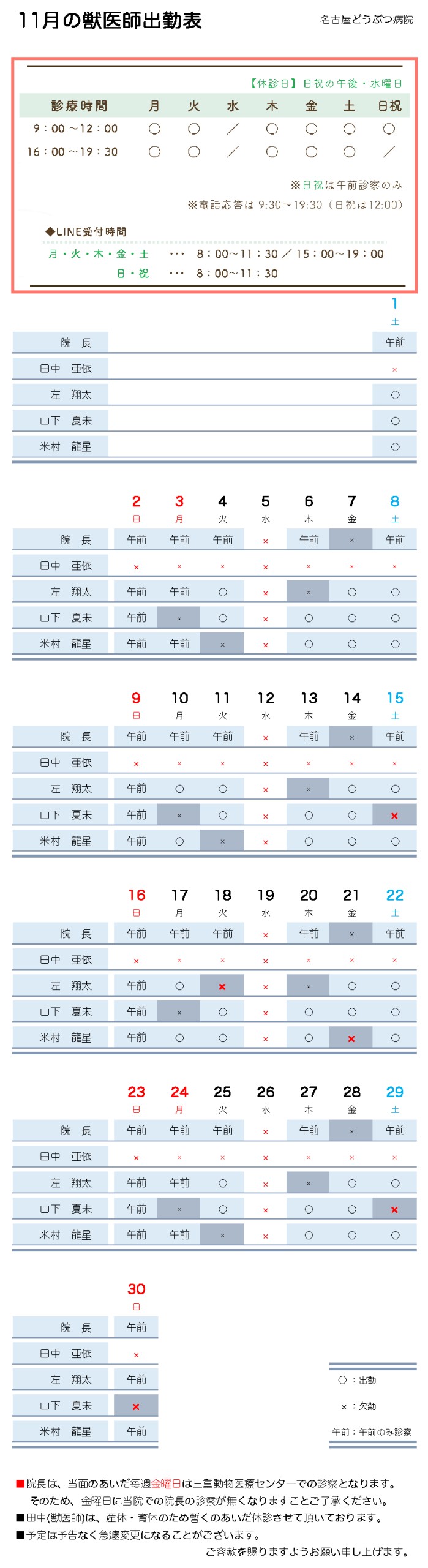 11月の休診日および獣医師出勤表(お手数をお掛けいたしますが、ご来院前に担当医の出勤日をご確認ください)